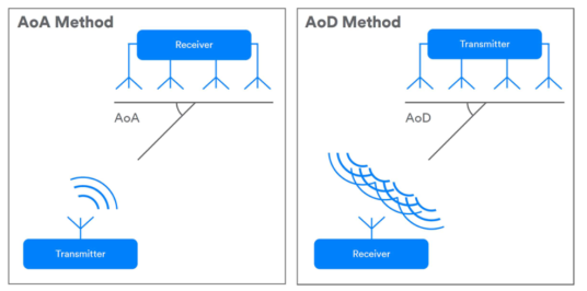 最新藍(lán)牙標(biāo)準(zhǔn)(5.1)允許系統(tǒng)使用天線陣列來確定通信方向(圖3)。使用天線陣列的單個(gè)設(shè)備可以與任何其他藍(lán)牙設(shè)備一起確定彼此的相對(duì)方向。這是通過測量到達(dá)角(AoA)或離開角(AoD),這取決于通信的方向和哪個(gè)設(shè)備有天線陣列。